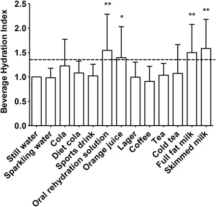 Ela ocorre quando o corpo perde mais líquidos e eletrólitos do que gasta. A água é um dos elementos mais puros que o organismo pede para funcionar, porém alguns outros podem auxiliar na hidratação. A seguir temos um estudo mostrando quais os líquidos que mais hidratam, feito pelo The American Journal of Clinical Nutrition.